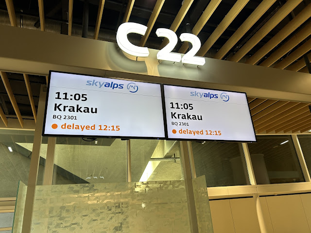 Geplanter Abflug in Wien mit der Südtiroler Linie "Skyalps" war um 11 Uhr, zwei Stunden vorher fand ich mich am Vienna International Airport ein. Ausnahmsweise viel zu früh, denn kurz darauf kam die Info, dass sich der Abflug aufgrund technischer Probleme am 72 Sitze fassenden Fluggerät verzögern wird. Um 13:02 Uhr ging es aber los nach Polen, etwas mehr als eine Stunde später landete der Flieger am nach Papst Johannes Paul II (einst Bischof von Krakau) benannten Airport der zweitgrößten Stadt Polens. Unser Mannschaftsbus mit dem Großgepäck war längst vor Ort, rund 40 Minuten dauerte es dann bis ins Teamhotel, einem Hilton Garden Inn rund zehn Autominuten von der bereits erwähnten historischen Altstadt.